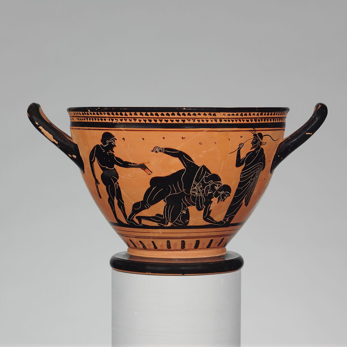 The Pankration was an athletic contest that combined boxing, wrestling, and kicking. In the surviving representations, it is not always easy to distinguish the pankration from boxing or wrestling matches. Such is the case here where the competition takes place under the eyes of a trainer and an onlooker.
