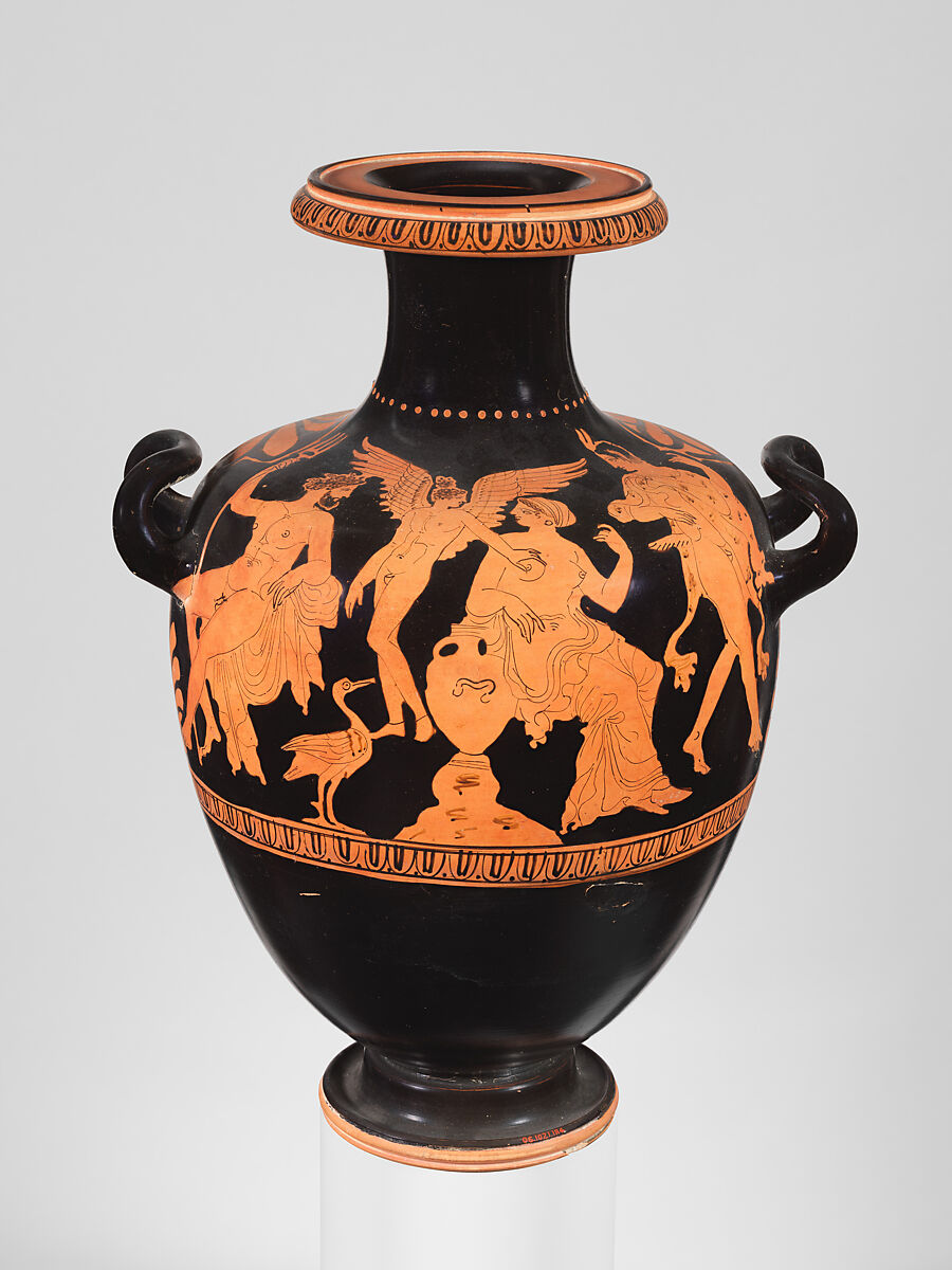 Danaos, a mythical king, had fifty daughters whom he sent out to find water during a great drought. One of them, Amymone, was accosted by a satyr but rescued by the sea god, Poseidon, who sought her favors for himself. In return, he struck the earth with his trident and created a spring. The vase shows Poseidon and Amymone seated on either side of Eros, the god of love, and a waterbird.