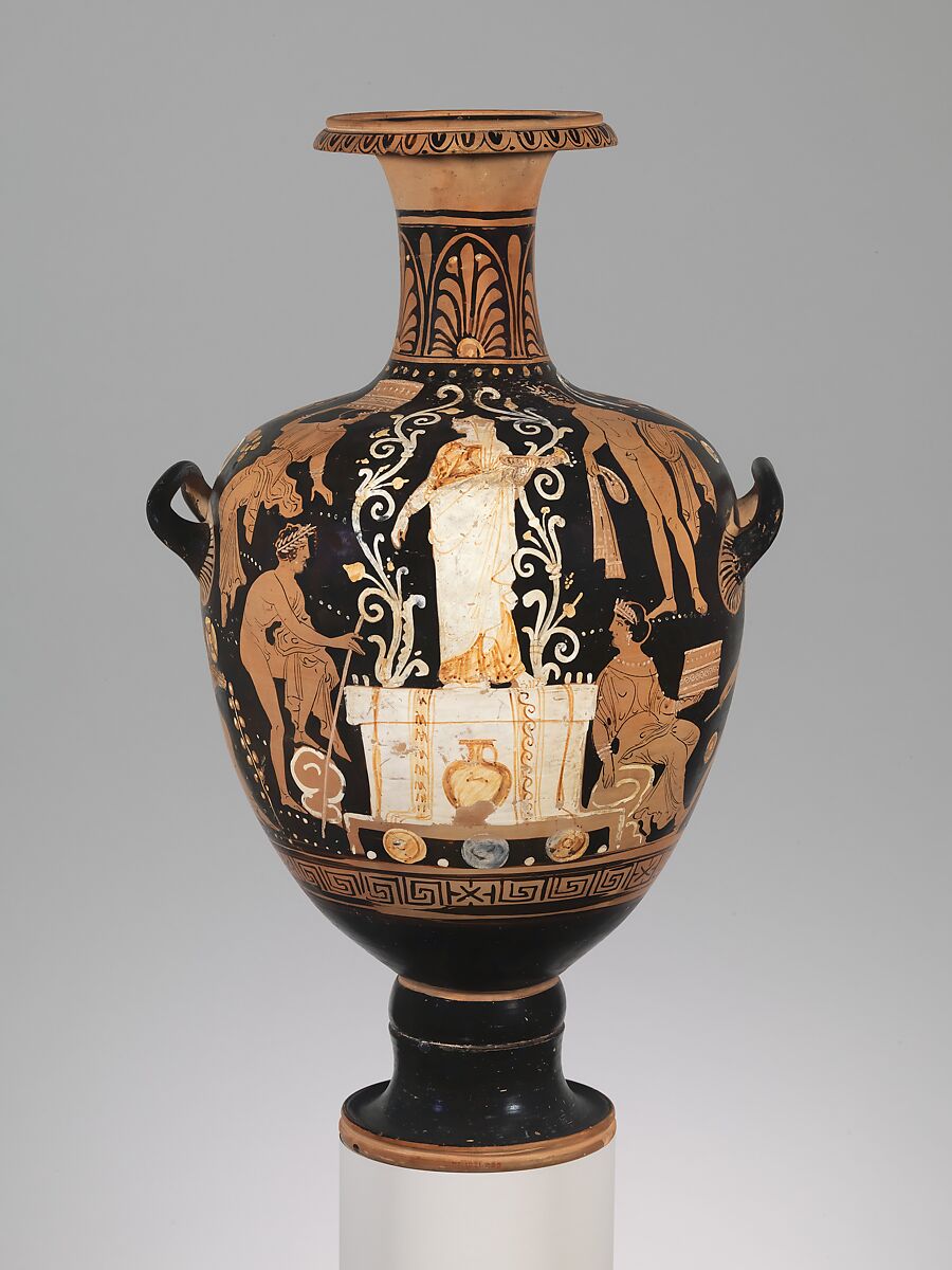 In South Italian vase-painting, the rare representations of funerary statues generally precede the appearance of naiskoi (shrines). This exceptional scene shows the image of a bride with a crown and phiale (libation bowl). She stands on a high base. Tendrils on either side form a kind of arbor, and a hydria and three phialai appear below.
