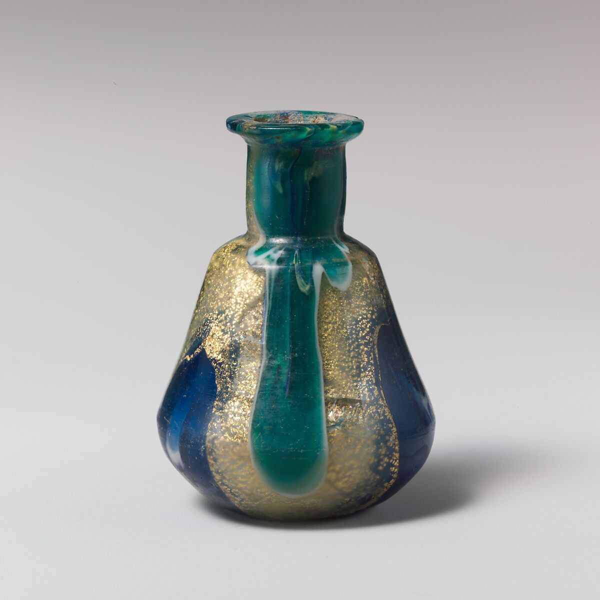 Gold-band cast glass was a particularly opulent type of early Roman glassware. It combines canes of brightly colored translucent and opaque glass with strips of gold leaf encased between layers of colorless glass. Only a limited number of vessel shapes were made in this way, and some of the most common are small globular or carinated bottles such as these. Similar shapes are also found amongst the earliest free-blown and mold-blown bottles that made glass cheap and accessible to most Romans. Gold-band glass, however, was undoubtedly a luxury product that only the very rich could afford.
