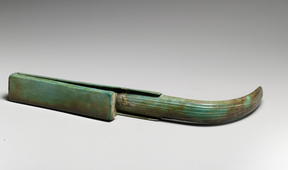 The shape of the strigil and its spring handle identify it as a type that became established in the first half of the first century B.C. The inscription probably gives the name of the owner, Agemachos.