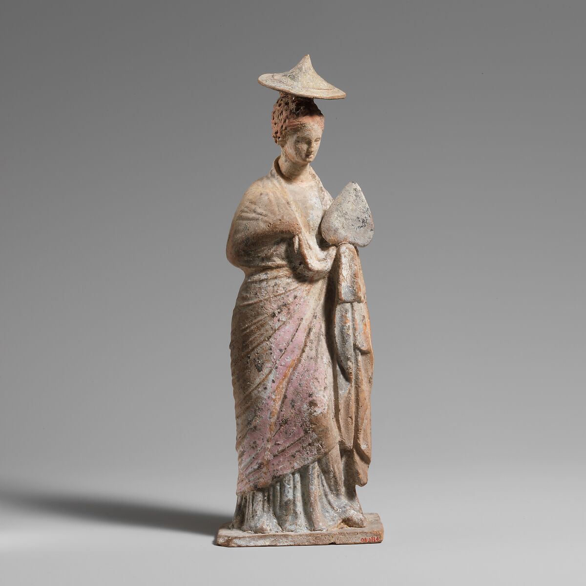 Much of the polychromy, which was added after firing, is beautifully preserved. The mantle has pink dye and Egyptian blue. There is additional Egyptian blue on the chiton and red for the hair.