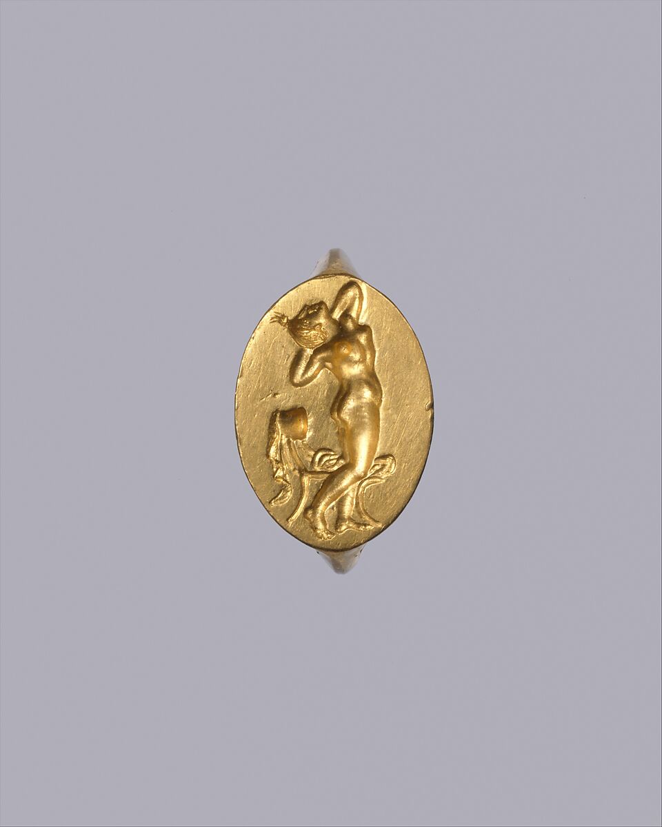 Nude girl stretching or dancing; ring hammered out of solid gold.