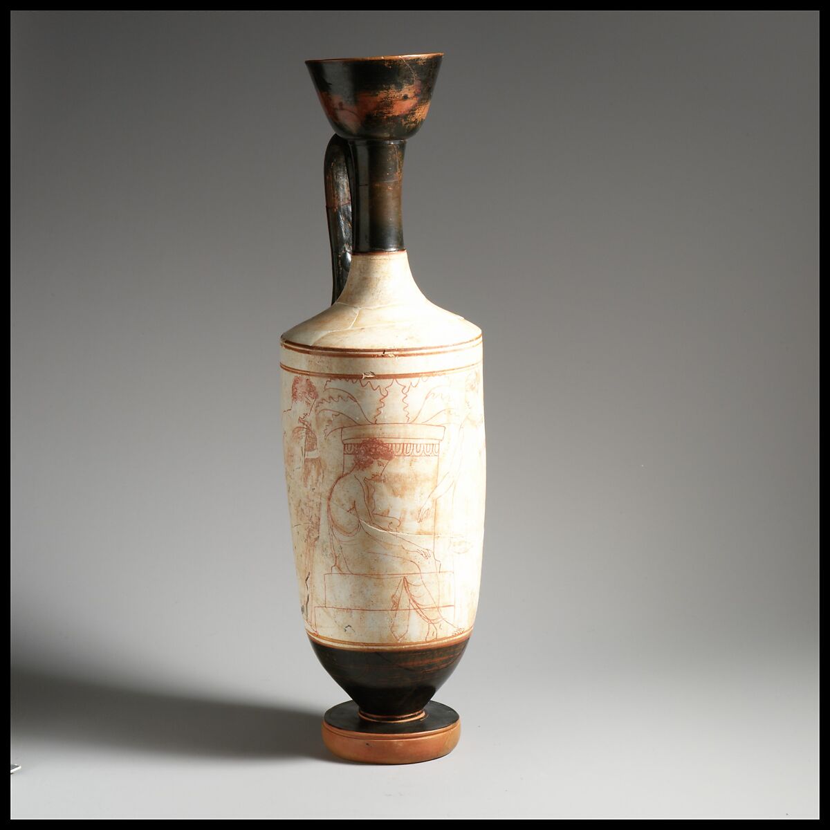 The youth in the center, undoubtedly the deceased, is seated on the steps of his tomb. The shaft behind him is crowned by remarkably succulent akanthos leaves. The woman at the right carries a basket containing two lekythoi and an alabastron (perfume vase). The central figure fits into the composition rather awkwardly, but the intent is clearly to provide an image of the departed being mourned by those around him.