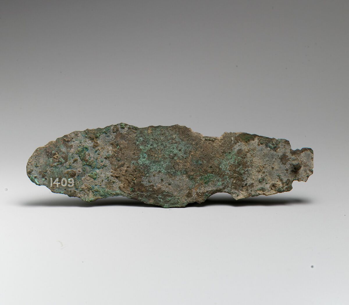 Straight base with three rivet holes, in one of which the rivet is still preserved. The blade is wider in the middle than at the ends.