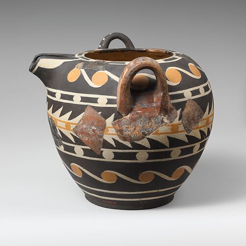 Tubular spout and three handles, with bands and spirals, dark on light ware.