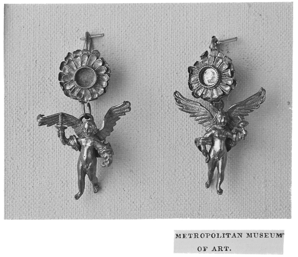 The winged Eros was a particularly popular image for earrings, because he would appear to be flying when suspended from the wearer's ear.