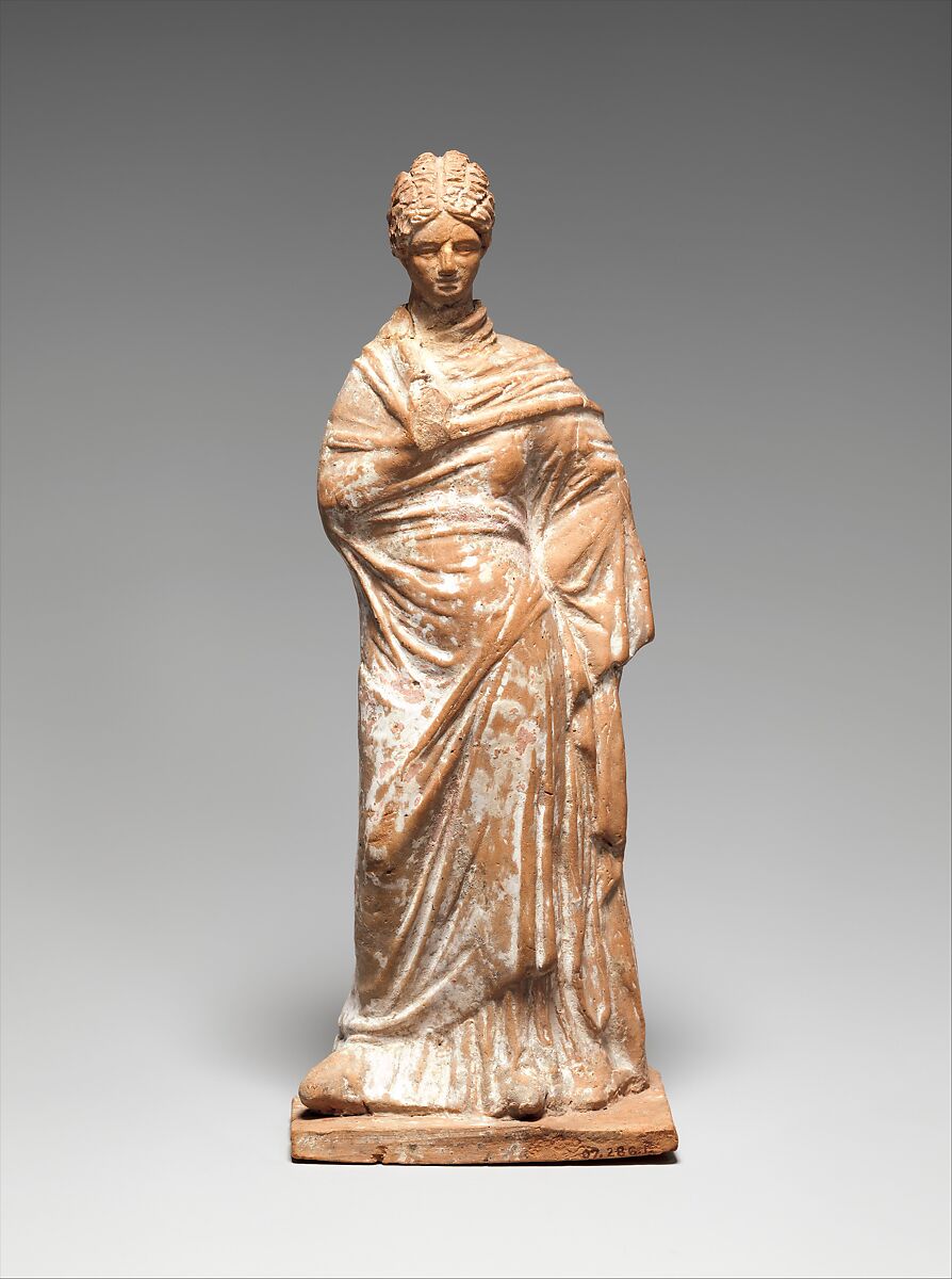 Weight on left leg, right foot drawn to side. Enveloping mantle from shoulders to right ankle and left calf. Right arm bent, hand beneath mantle pulls cloth down from neck. Left hand at hip, zigzag drapery falls from arm to hem. Rough melon coiffure, with punched chignon at nape. Plaque base.