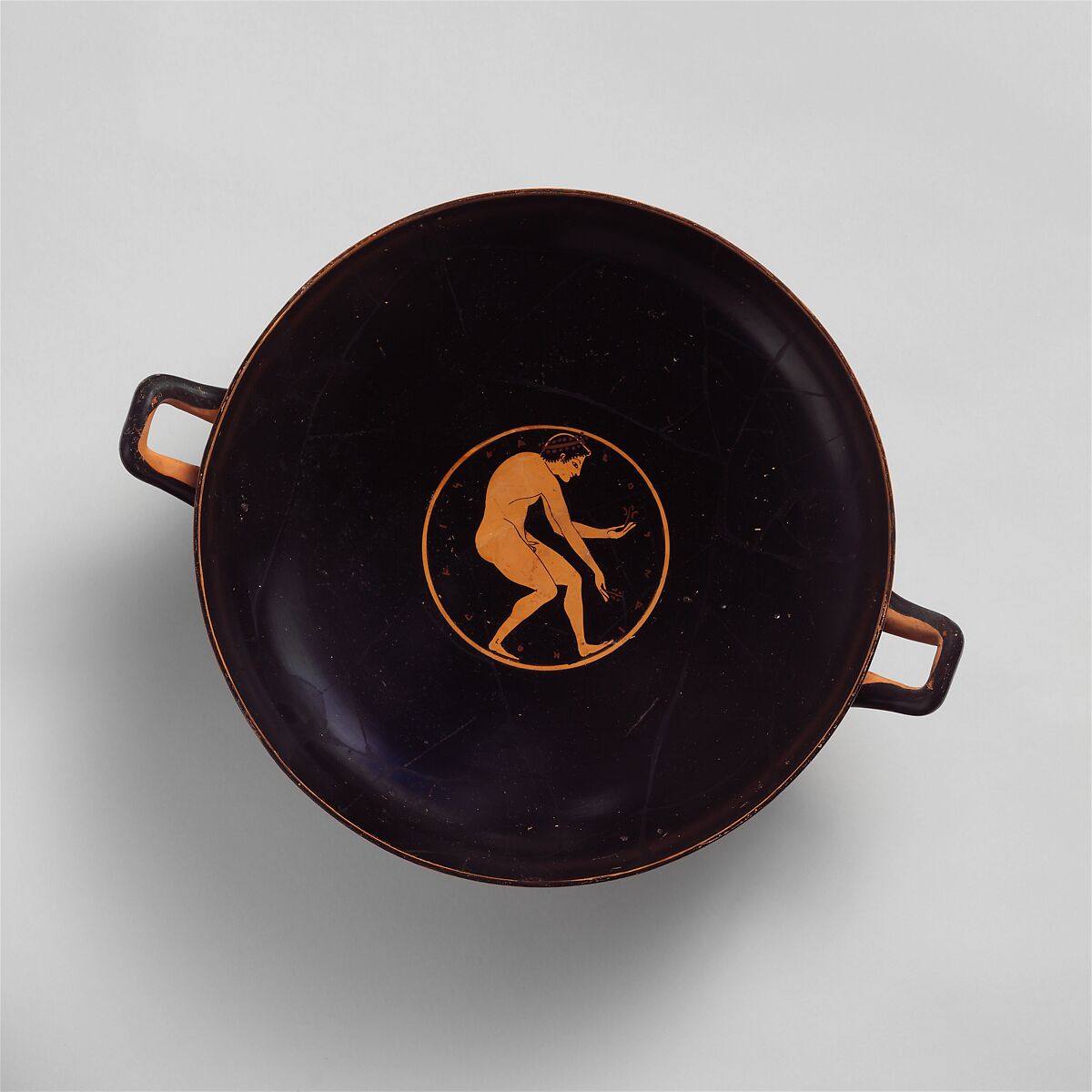 The youths on the exterior are practicing with jumping weights, preparing to hurl the javelin, and throwing the diskos. There are two Etruscan inscriptions on the underside of the foot.