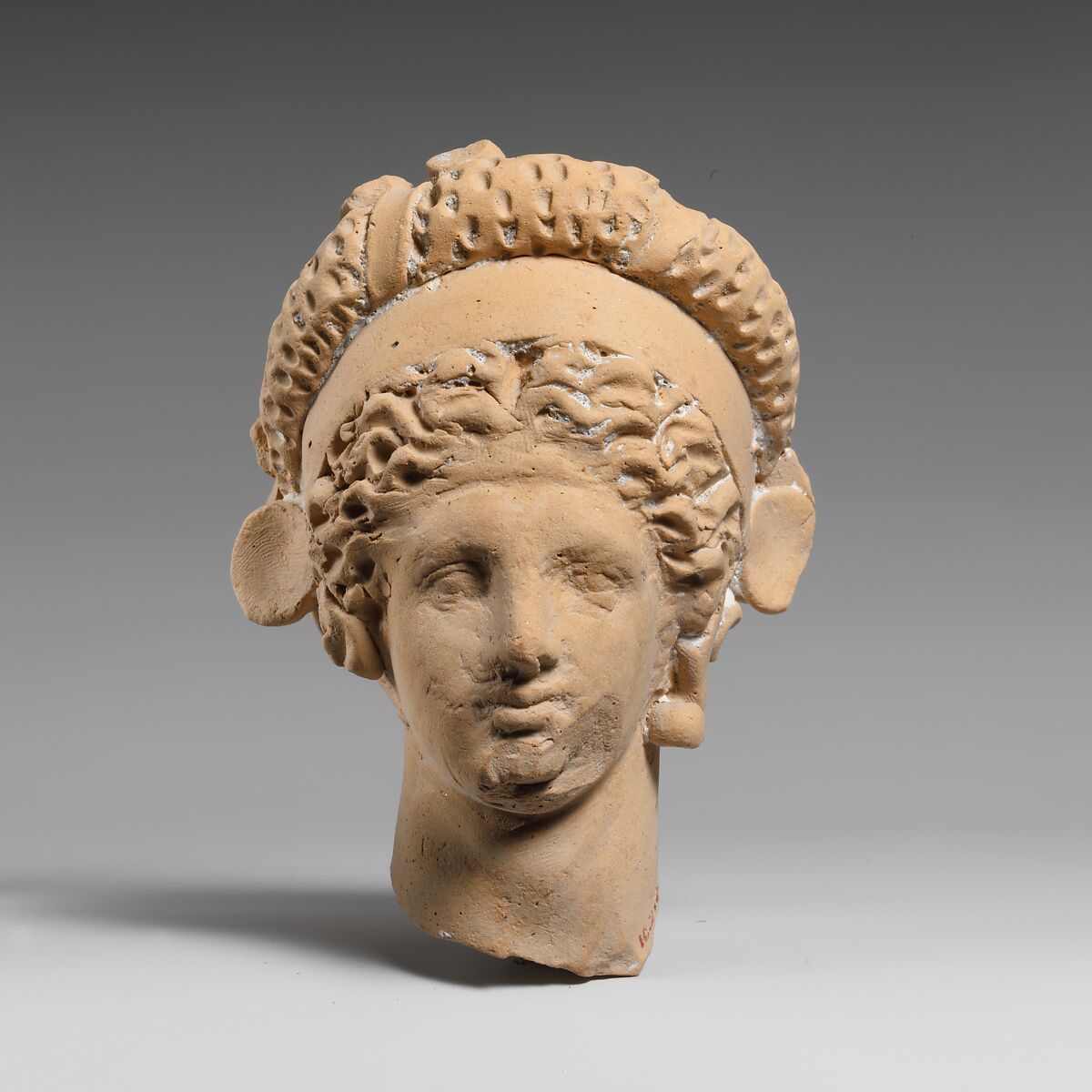 The elaborate headdress consists of a flat band with a disk at either side and, above, a tubular circlet.