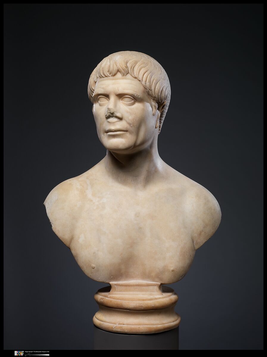 This man’s resolute expression and the simple yet studied arrangement of locks at his forehead bring to mind official portraits of the emperor Trajan (r. A.D. 98–117).