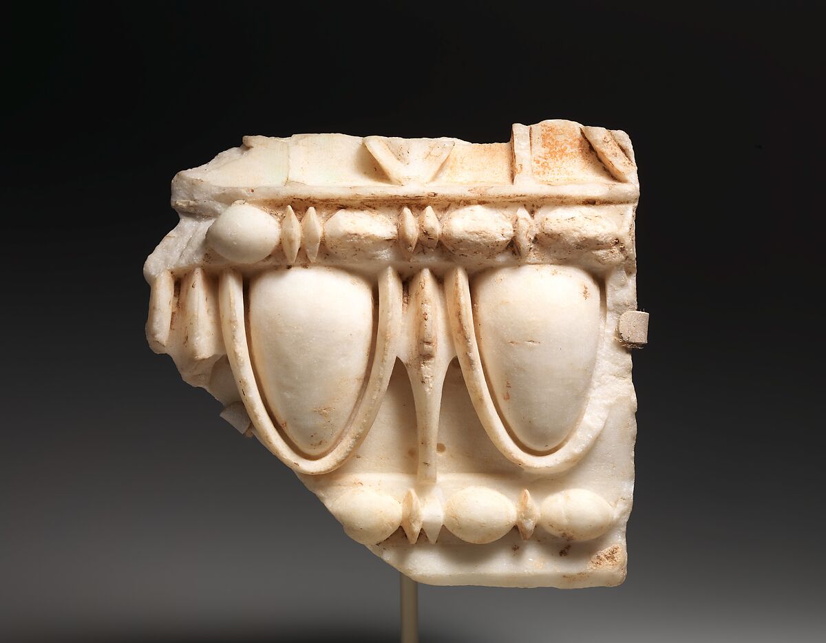 This exquisite fragment belongs to one of the decorative moldings of the Erechtheum, the building on the Athenian Akropolis that accommodated a variety of venerable cults and sanctuaries. The molding consists of a row of egg and dart framed above and below by bead and reel. Originally it would have been painted.