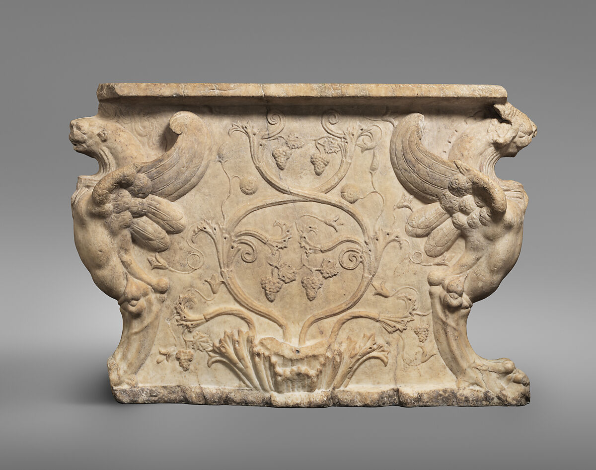 This marble trapezophoros is one of a pair of supports for a large tabletop that probably stood in the atrium of a wealthy family’s house. Its two sides are finely carved with grape vines and floral sprays issuing from acanthus fronds that bring to mind the intricate vegetal designs on public monuments of the Augustan age, notably the panels with acanthus and swan reliefs on the Ara Pacis Augustae in