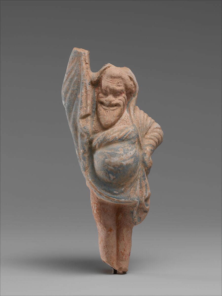 Fourteen of these figures are said to have been found together in a burial in Attica. They are among the earliest known statuettes of actors and are superbly executed and preserved. Originally they were brightly painted. They document the beginning of standardized characters and masks, indicating the popularity not of a specific figure but of types—the old man, the slave, the courtesan, etc.—that appeared repeatedly in different plays. By the mid-fourth century B.C., Attic examples or local copies were known throughout the Greek world, from Southern Russia to Spain.