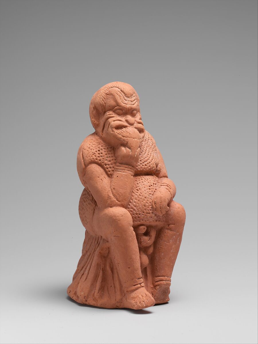 Fourteen of these figures are said to have been found together in a burial in Attica. They are among the earliest known statuettes of actors and are superbly executed and preserved. Originally they were brightly painted. They document the beginning of standardized characters and masks, indicating the popularity not of a specific figure but of types—the old man, the slave, the courtesan, etc.—that appeared repeatedly in different plays. By the mid-fourth century B.C., Attic examples or local copies were known throughout the Greek world, from Southern Russia to Spain.