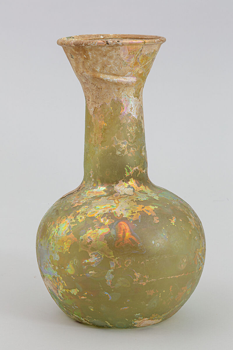 Complete, but broken and restored around rim and mouth; few pinprick bubbles; deep pitting with areas of dulling, brilliant iridescence, and thick creamy weathering.