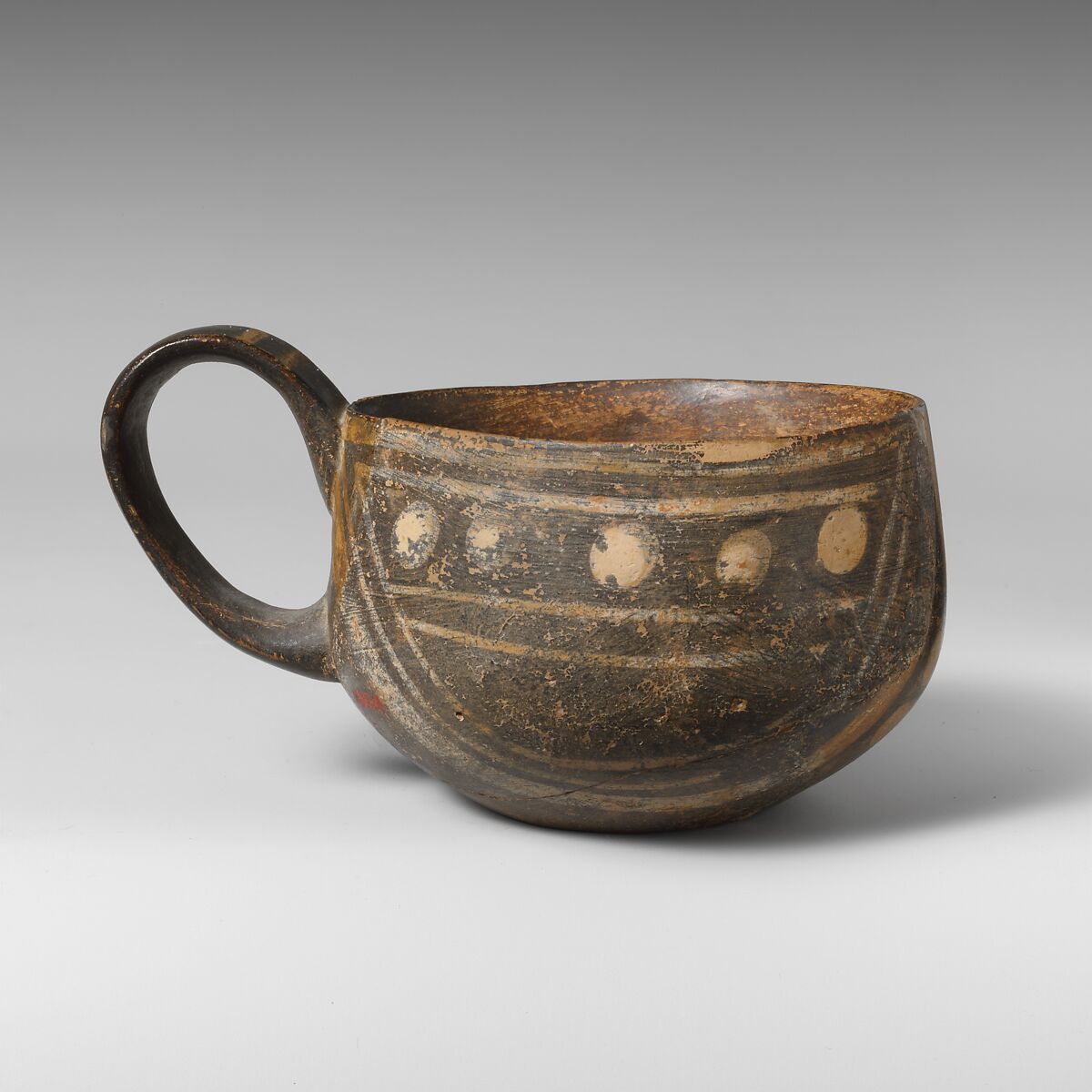 - Title: Terracotta one-handled cup, white-on-dark ware