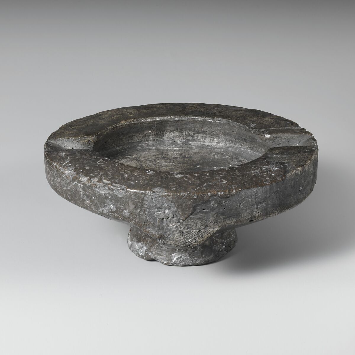 Oil would have been placed in the bowl, and wicks could rest on the two cuttings in the rim. This is a good example of one of the most characteristic types of stone lamps that were made in the Neopalatial period.