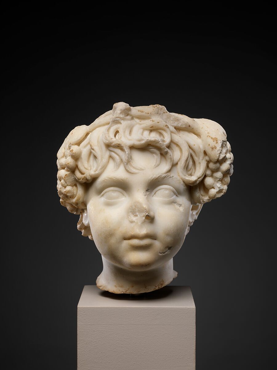 The child wears a wreath of grape clusters and leaves, associating him with the cult of the god Dionysos.