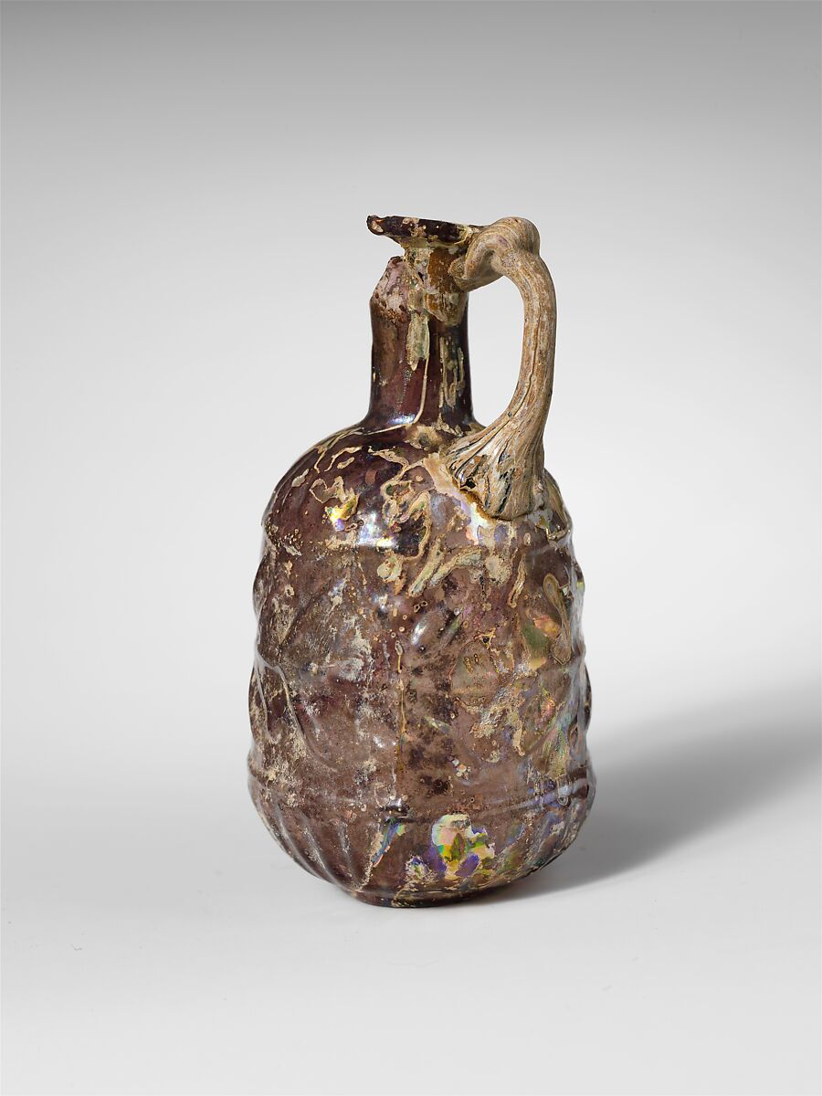 Rim, folded out, over, and in; broad flaring mouth; slender cylindrical neck; convex curving shoulder; cylindrical body, expanding downwards, then cup-shaped lower section; low circular base, with rounded edge and bottom concave at center; rod handle attached in a pad to shoulder, drawn up, round, and in, and folded onto underside of rim with slight fold above rim. A mold seam runs down sides; a separate cup-shaped section probably forms the lower body and base.