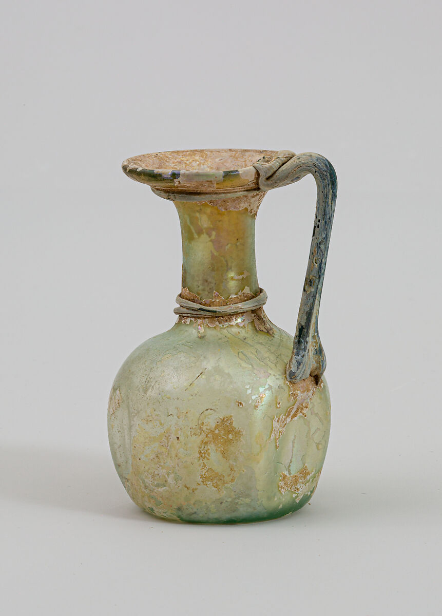 Rounded rim with slight inward lip; broad, flaring mouth; cylindrical neck, expanding slightly downwards; sloping, rounded shoulder; convex curving side to small body; thick, slightly pushed-in bottom, with small central pontil mark; rod handle applied as an irregular pad to outer edge of shoulder, drawn up and outwards, then turned in and down, and trailed onto rim and underside of mouth over trail.