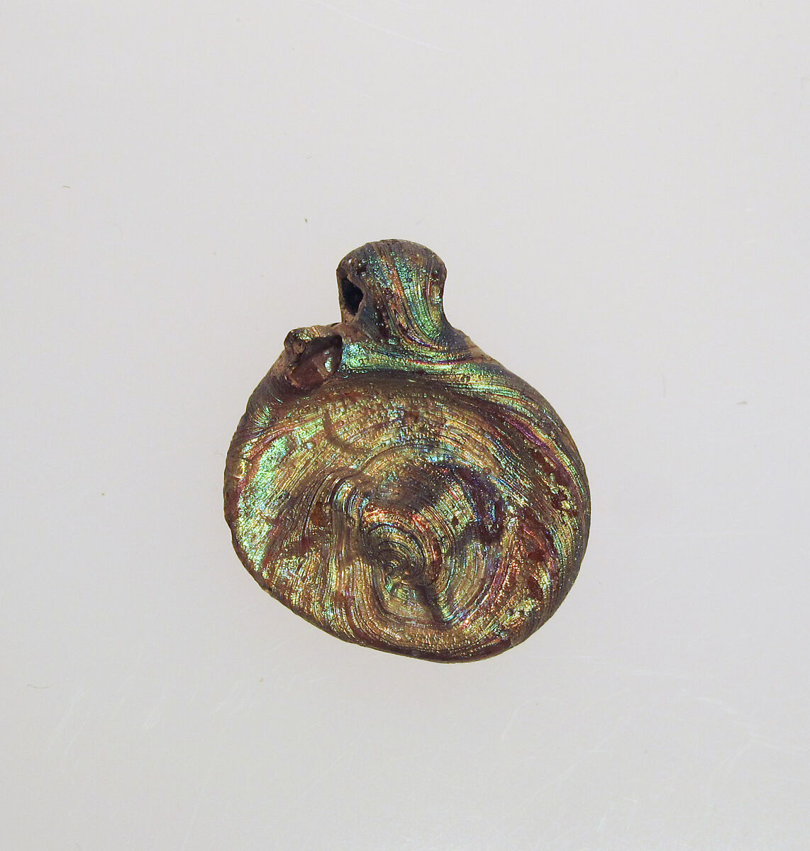 Oval disk with thick rounded edge on right half; uneven, flat bottom; pierced suspension loop applied to front of disk, folded over, and pressed on to back edge.
