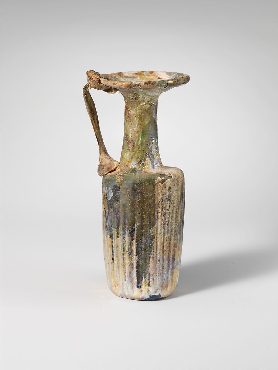 Rim folded round and in and pressed flat into broad, flaring mouth; cylindrical neck, expanding downwards; narrow horizontal shoulder; cylindrical body with side tapering slightly downwards; pushed-in bottom with circular pontil scar; handle applied in a large pad to shoulder, drawn up and outwards, then turned in and folded on to underside of mouth and edge of rim with projecting trail above.