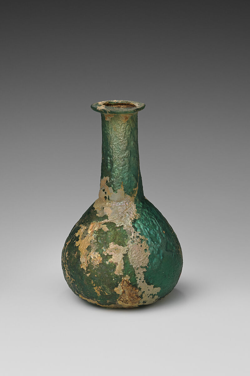 Rim folded out, over, and in, with slightly beveled and irregular upper lip; cylindrical neck expanding downward, with tooled indent around base; squat piriform body, curving in sharply to bottom with slightly concave center.