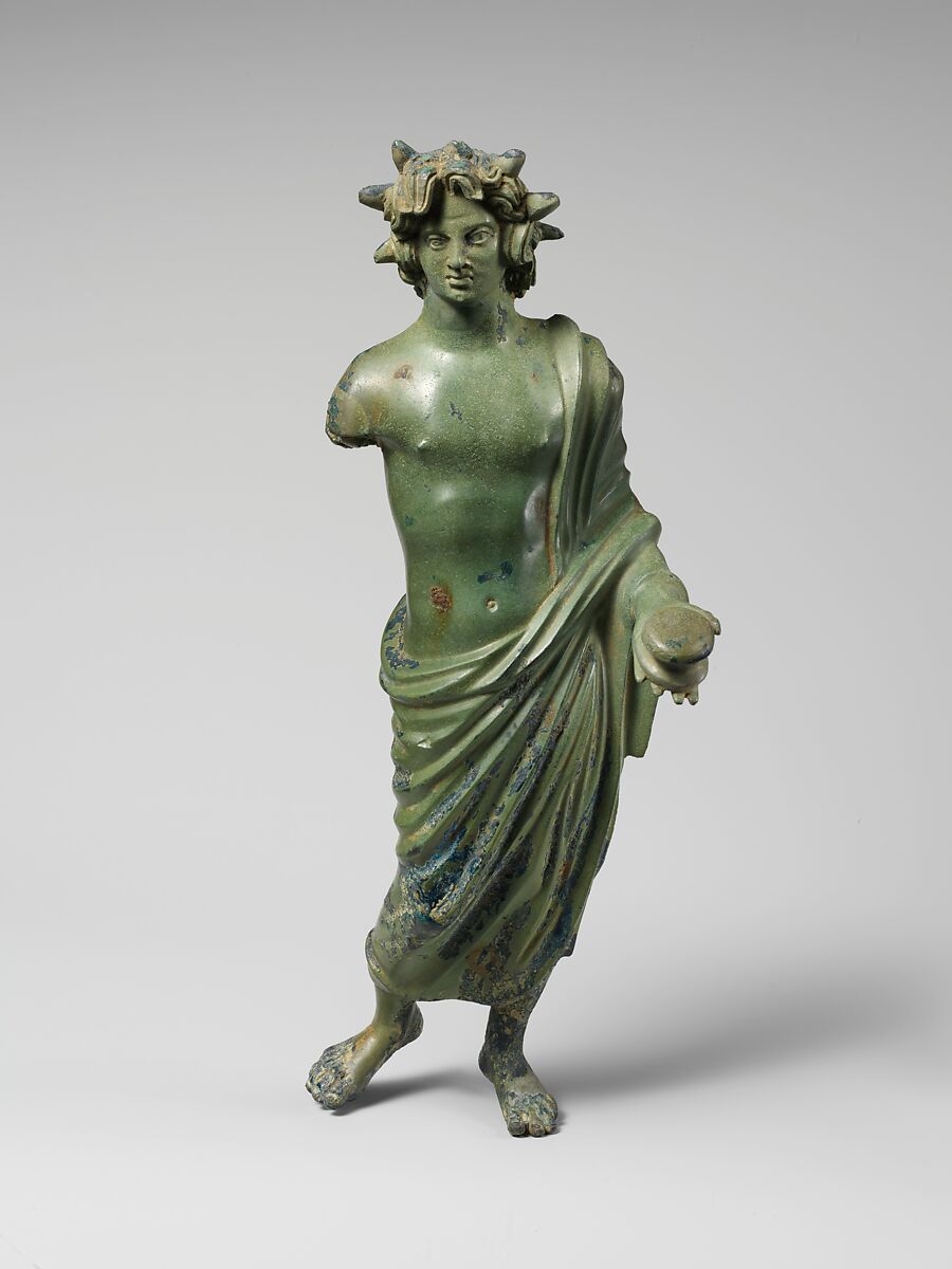 The idealized features and seminudity of this carefully executed bronze statuette suggest that he represents a deity. The radiate crown indicates a solar deity, perhaps Apollo or Helios (called by the Etruscans Apulu and Usil). The object in his left hand may be an incense box. Perhaps his missing right hand once held a patera (libation bowl) resembling that held by another larger male figure (16.174.4).