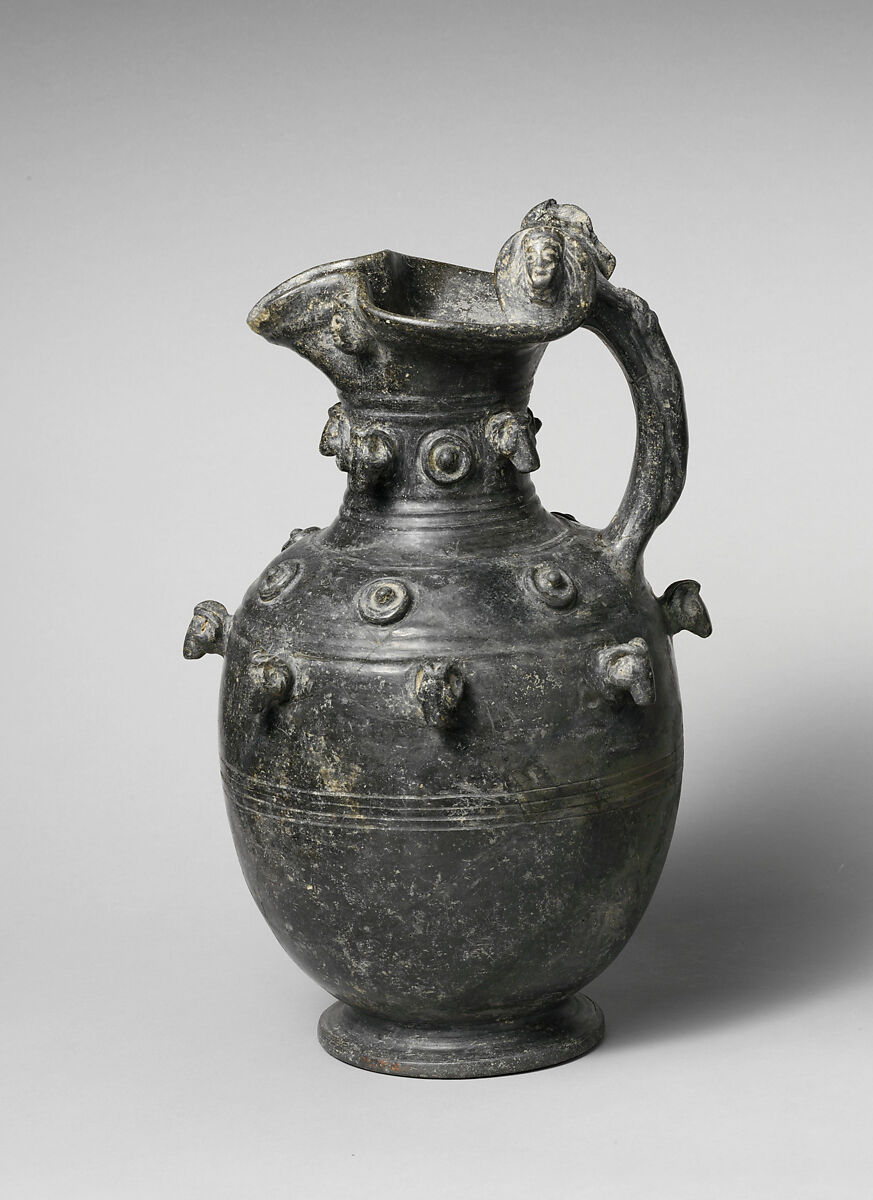 This standard bucchero shape is transformed into an exotic pitcher by incorporating numerous clay rams' heads, human heads, and bosses to the rim, neck, shoulder, and belly. The treatment is typical of Vulcian bucchero workshops.
