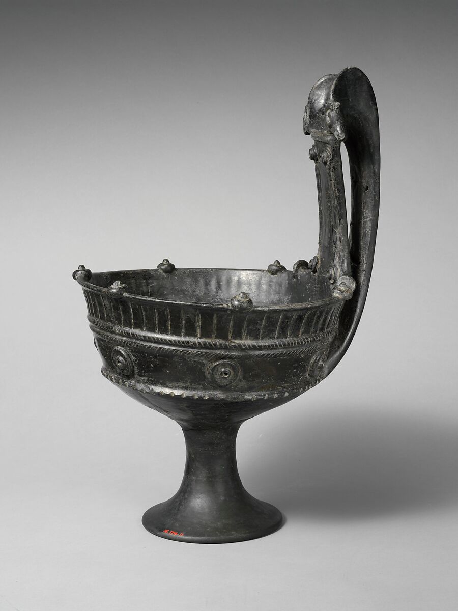 Oversized, elaborately decorated wine cups of this type are popular products of bucchero workshops at Vulci. Some are too large and heavy, especially when filled, to have been used by living banqueters. They may have been made expressly for the dead.