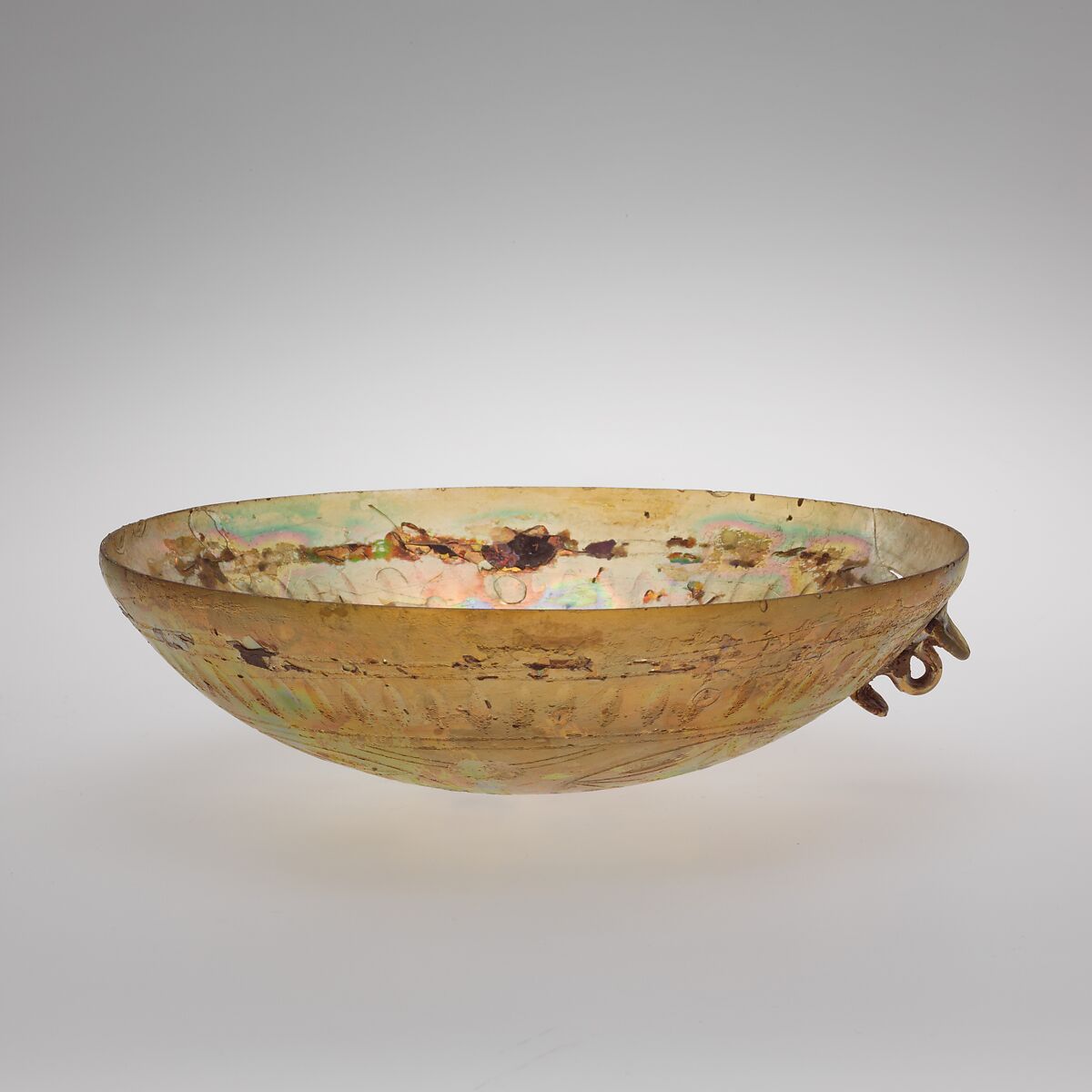 Bowls with similar geometric decoration, miniature handles, and even Greek inscriptions are known to be from the Rhineland. However, both of these examples are probably from the eastern half of the Empire. The purple bowl, which has lost most of its handle, has an engraved inscription in Greek, PIE ZESAIS (Drink [so that] you may live [well]). The same exhortation, but with a slightly different spelling, appears on another goblet (13.198.5) on view in this case.