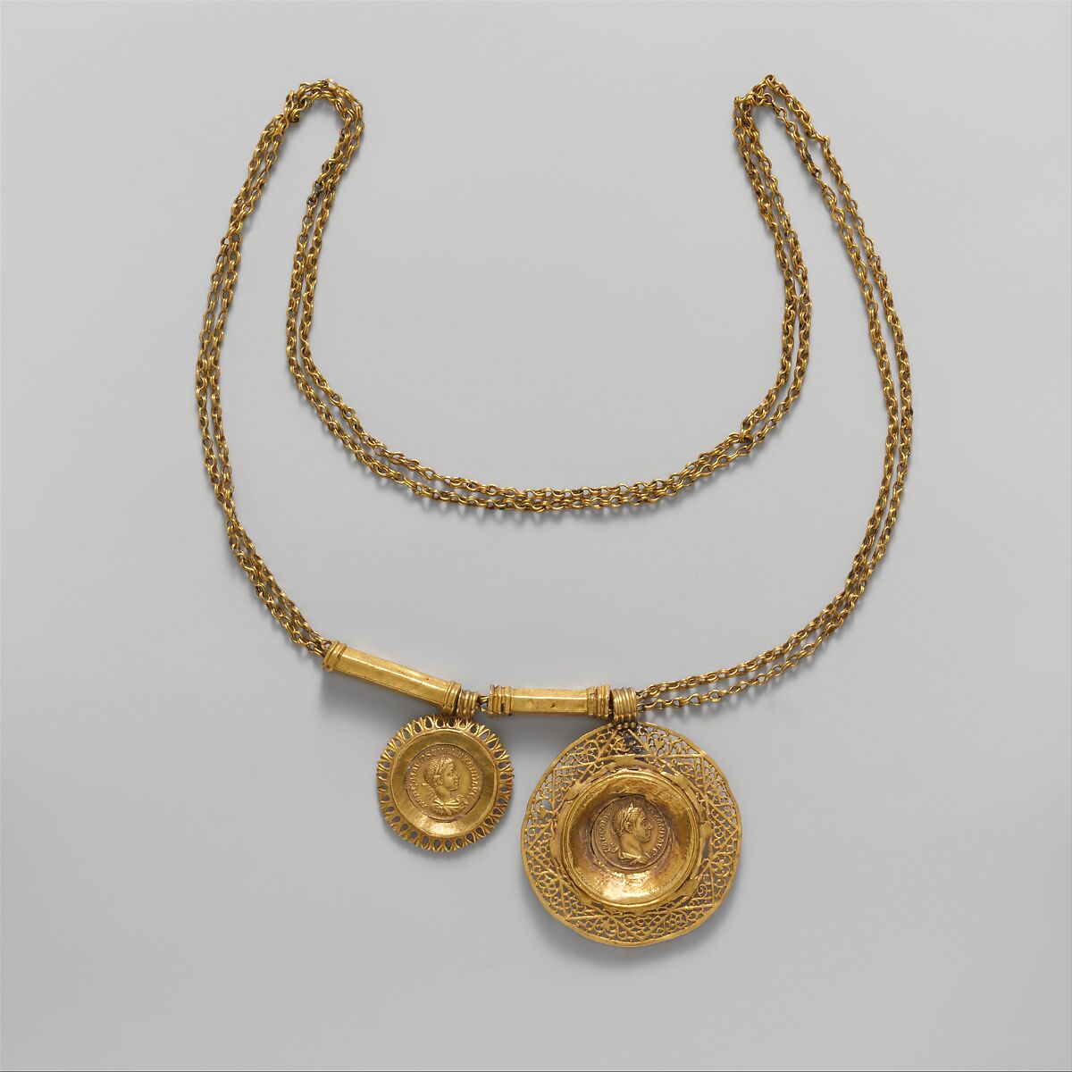 Two openwork pendants are suspended from a double chain of figure-of-eight loops. Each pendant is set with an aureus (gold coin) of the Emperor Alexander Severus (r. A.D. 222–235). Their different sizes and the second spacer suggest that additional pendants are now missing from the chain. The use of coins in jewelry became very fashionable in the third century and persisted until the early seventh century.