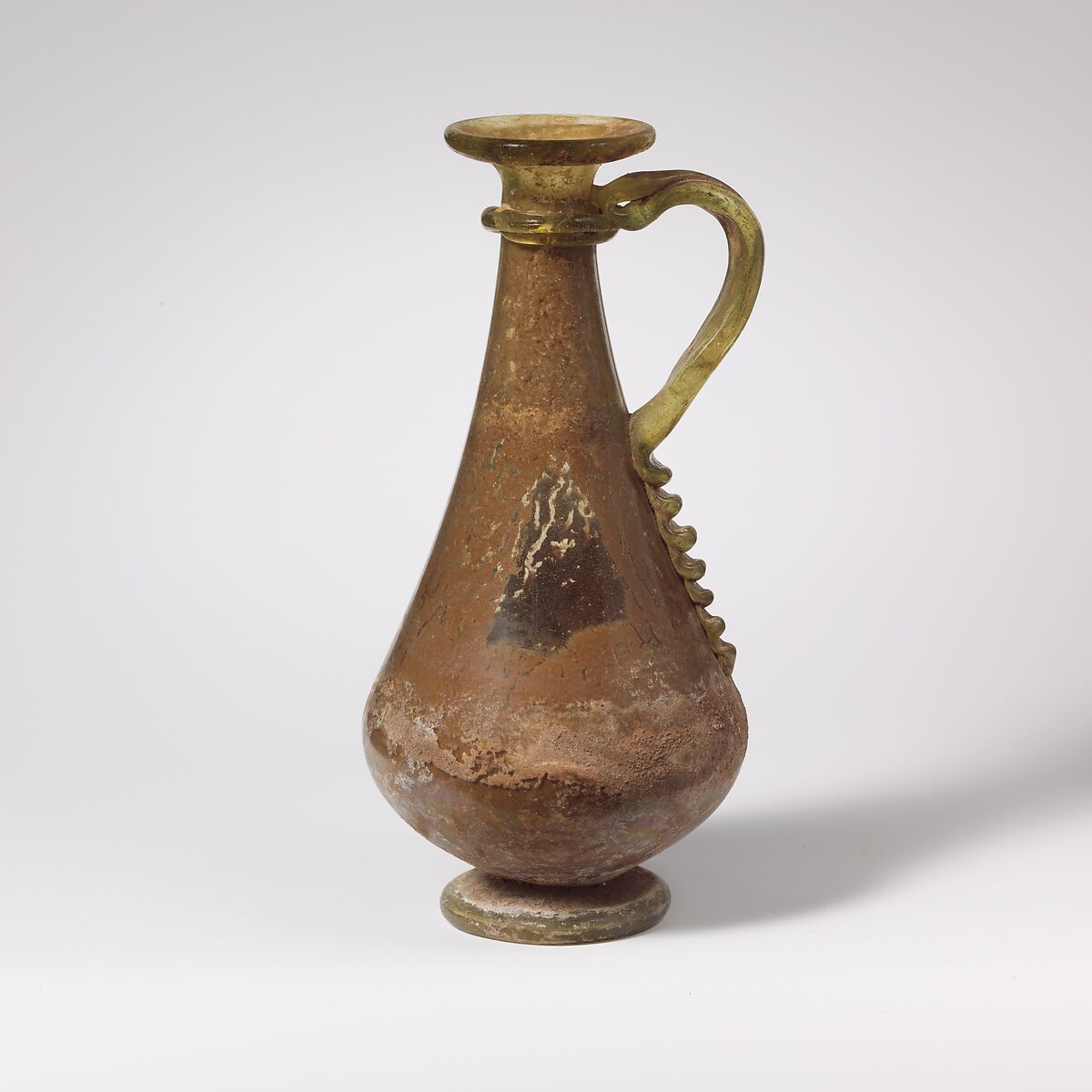 Everted rim with thick, rounded lip; short, flaring mouth; tall, elongated piriform body; outsplayed, tubular foot ring, made by folding; concave bottom with central kick and pontil scar; broad rod handle attached to upper body, with tail extending down side, drawn up in a arched curve and applied to trail around top of body, and trailed off back along itself.