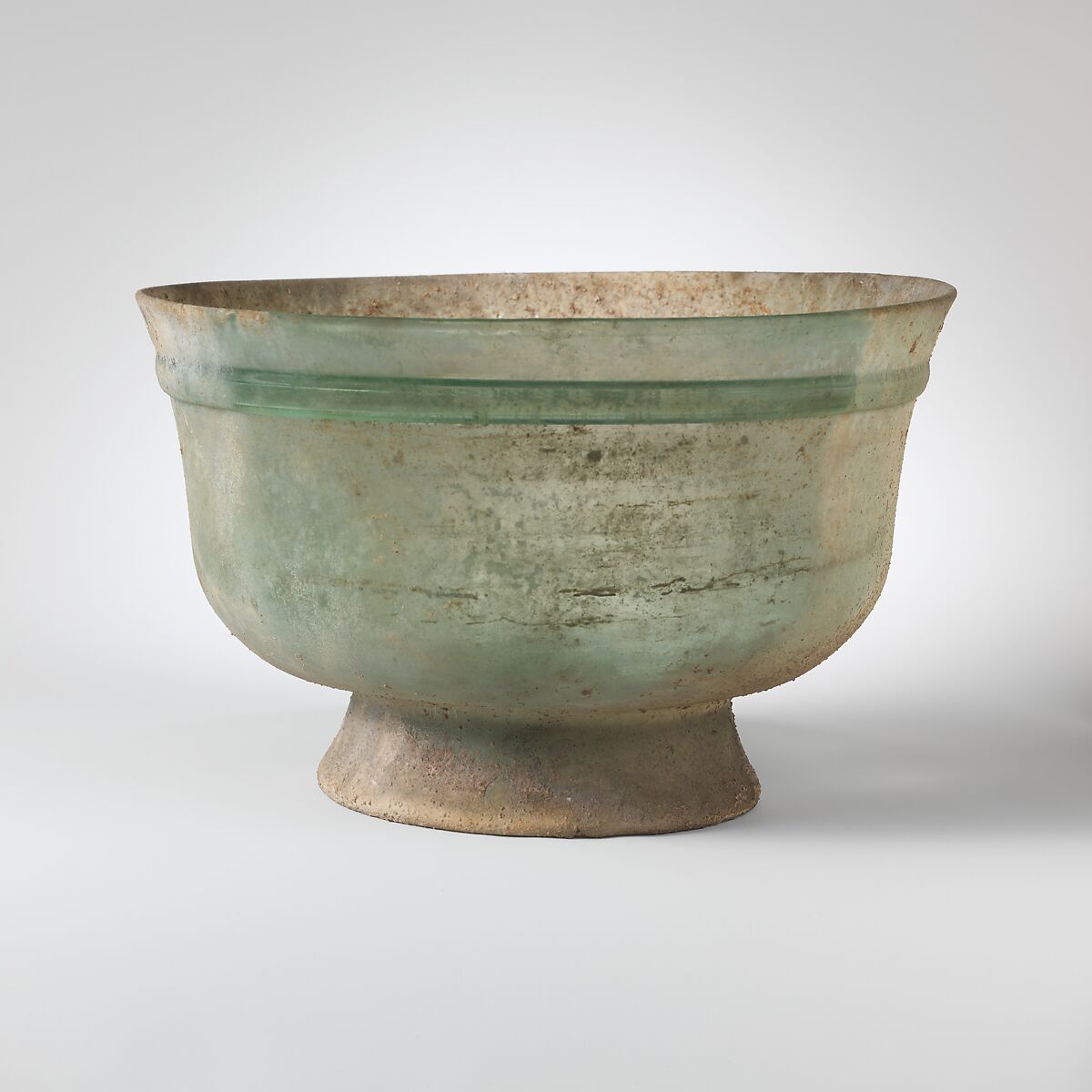 Rim slightly everted with rounded lip; below, broad tubular cordon made by folding; body tapering downwards with concave side, then curving in to tall, outsplayed tubular foot ring, made by folding; convex bottom with thick central dome and large pontil scar.