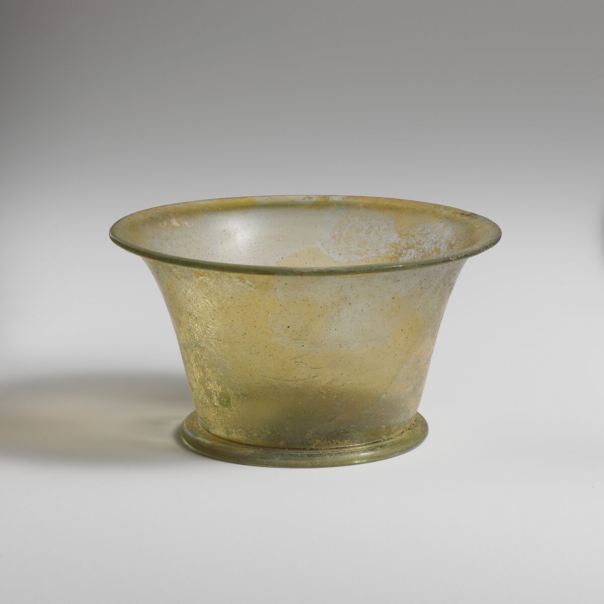 Outsplayed rim, with rounded, slightly thickened, horizontal lip; funnel-shaped body with gently curving side; hollow folded foot ring at junction of side and bottom; bottom convex around edge but concave at center, with trace of pontil mark.