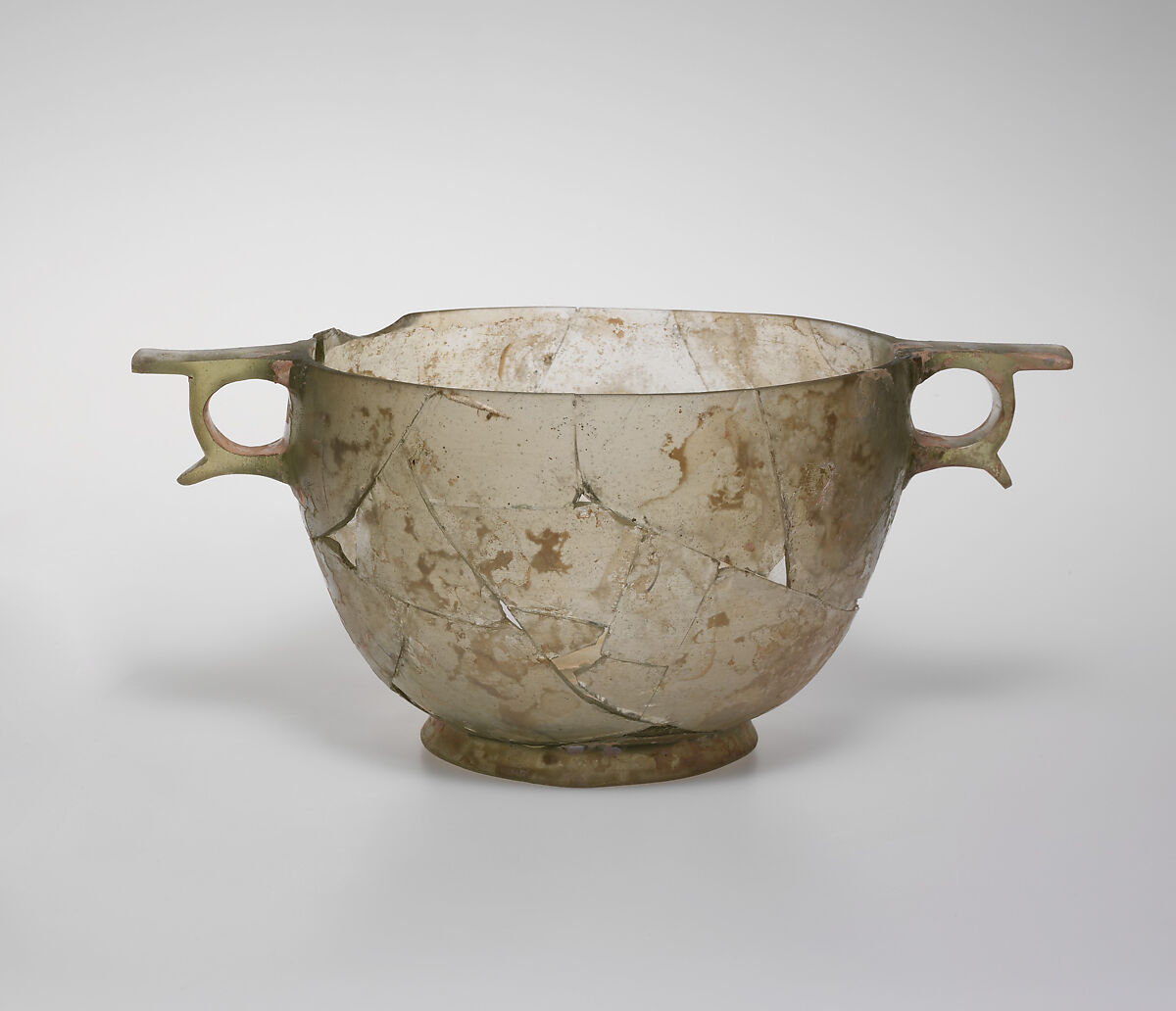 Body broken and repaired, with one large chip in rim and several holes in body, but both handles intact; pinprick and larger bubbles; dulling, pitting, patches of iridescence and creamy weathering.