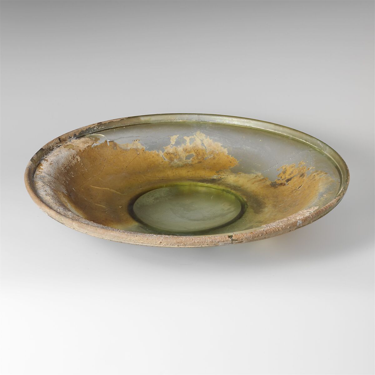 Broken and repaired, with only one small hole; some bubbles, elongated in rim; thick, limy encrustation, dulling, and slight iridescence.