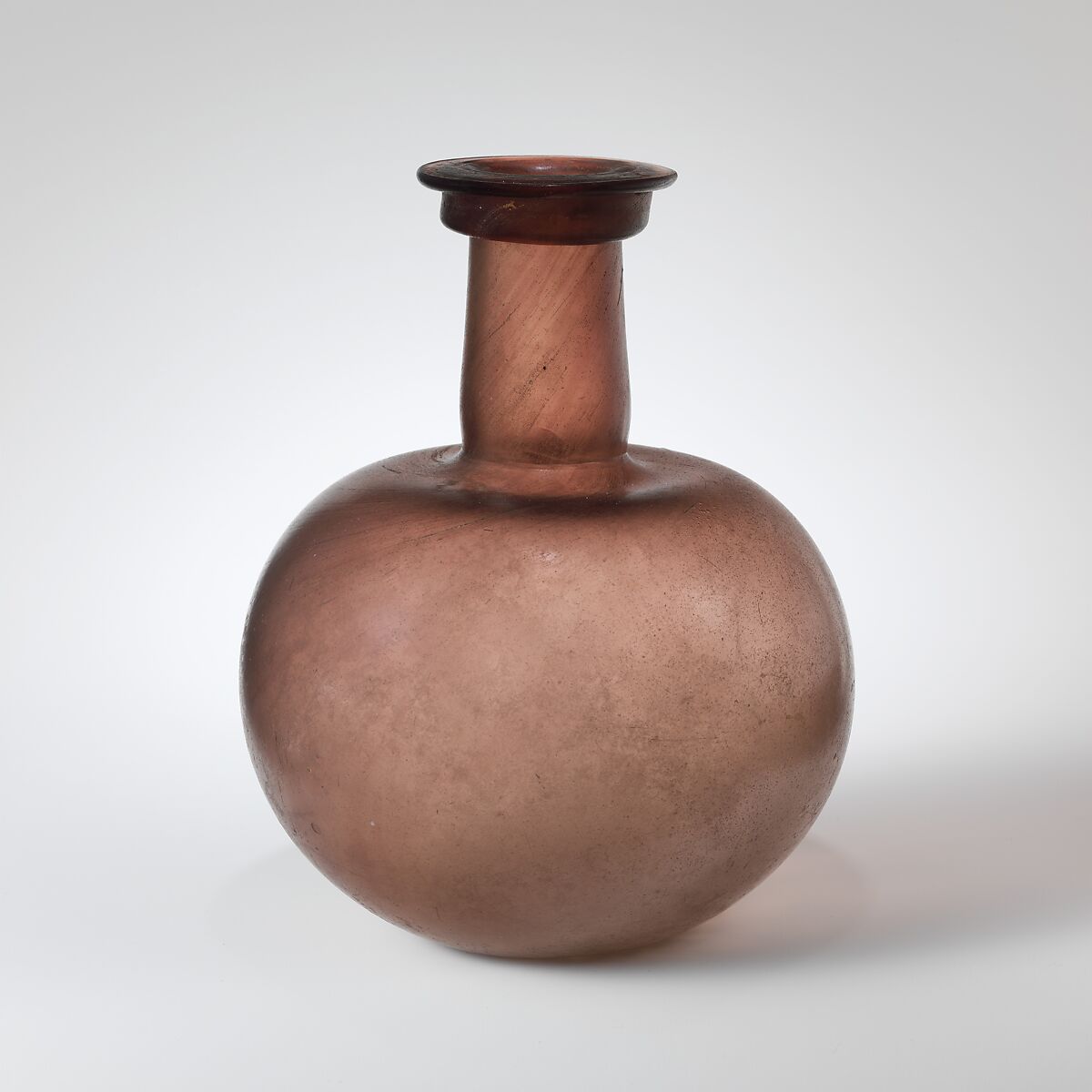 Large, violet bottle with round body, slender neck, and heavy rim.