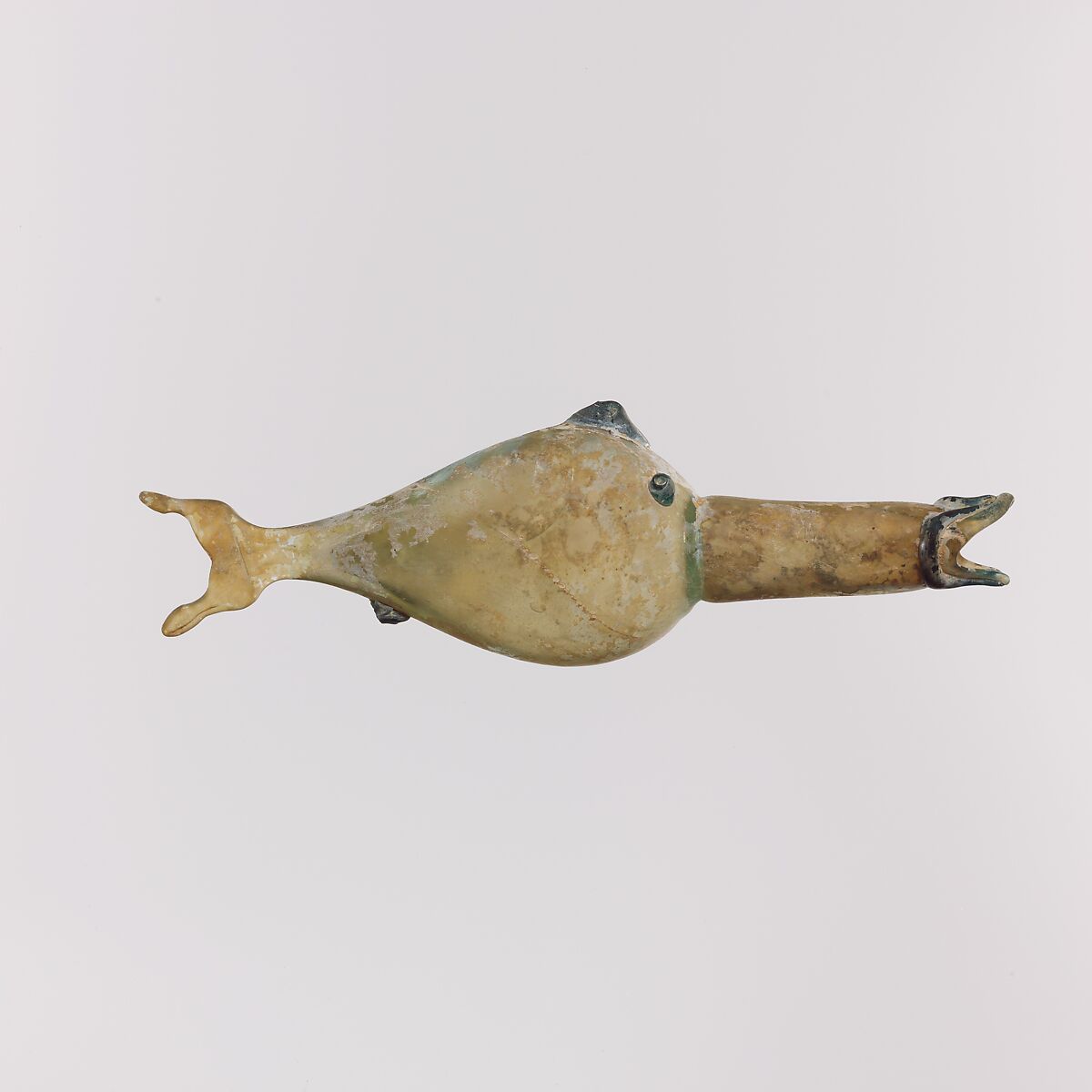 Rim tooled to form open mouth with projecting upper and lower jaws; cylindrical neck expanding downwards, folded in at base to form diaphragm with small central hole; lentoid body, tapering downwards, drawn out and pressed flat at bottom to form solid tail.