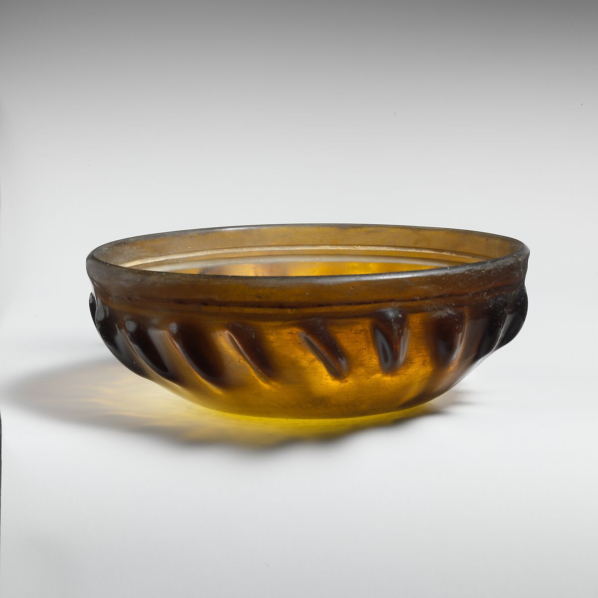 On interior, a band of two horizontal grooves below rim; on exterior, twenty diagonal ribs of varying length, width, and thickness, with irregular rounded tops, arranged around central part of side.