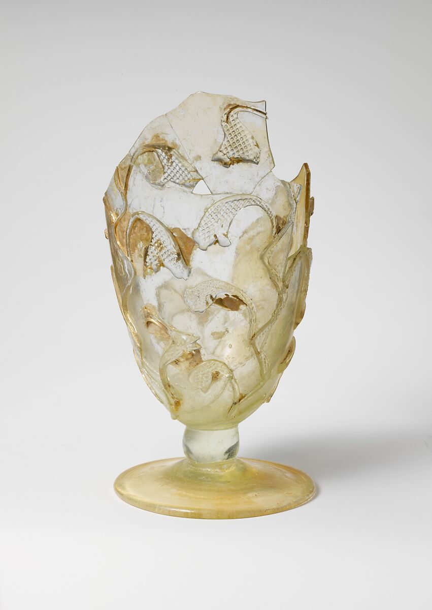 Tall beaker or goblet, with side tapering downwards and curving in at base; stem consists of a solid, slightly convex knob; broad, shallow foot, made from a separate gather is concave, with rounded, thickened edge, and small central pontil scar.