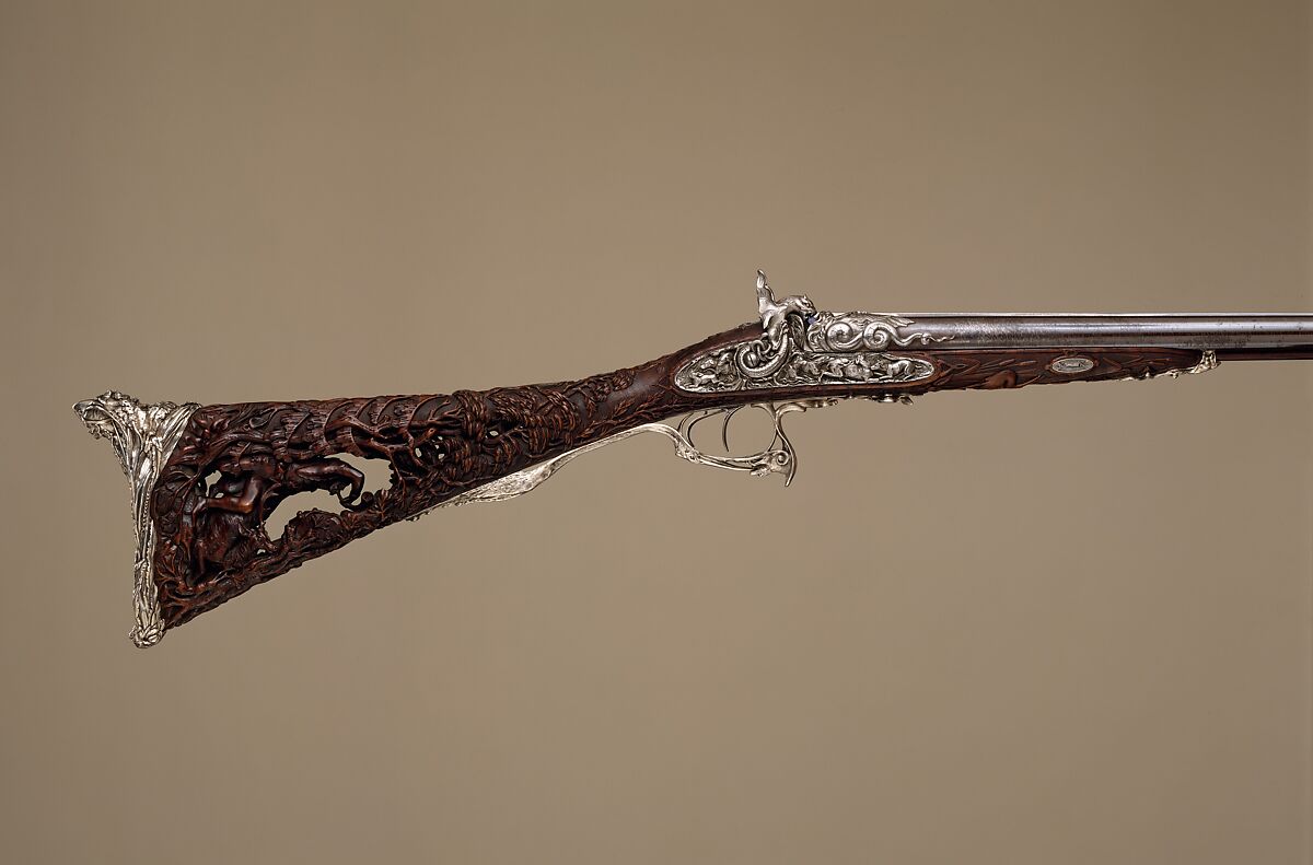 This is presumably the "richly decorated gun" said to have been exhibited by Perrin in 1855 at the Exposition Universelle in Paris and again in 1862 at the International Exhibition in London. Undoubtedly Louis Perrin's masterpiece, this shotgun is one of the most ambitious firearms of its period. The butt, pierced and carved in the round with the figure of a medieval hunter, reflects the lingering influence of the Gothic revival. The silver mounts are of extraordinary quality, notably the buttplate with its graceful figure of a Native American.