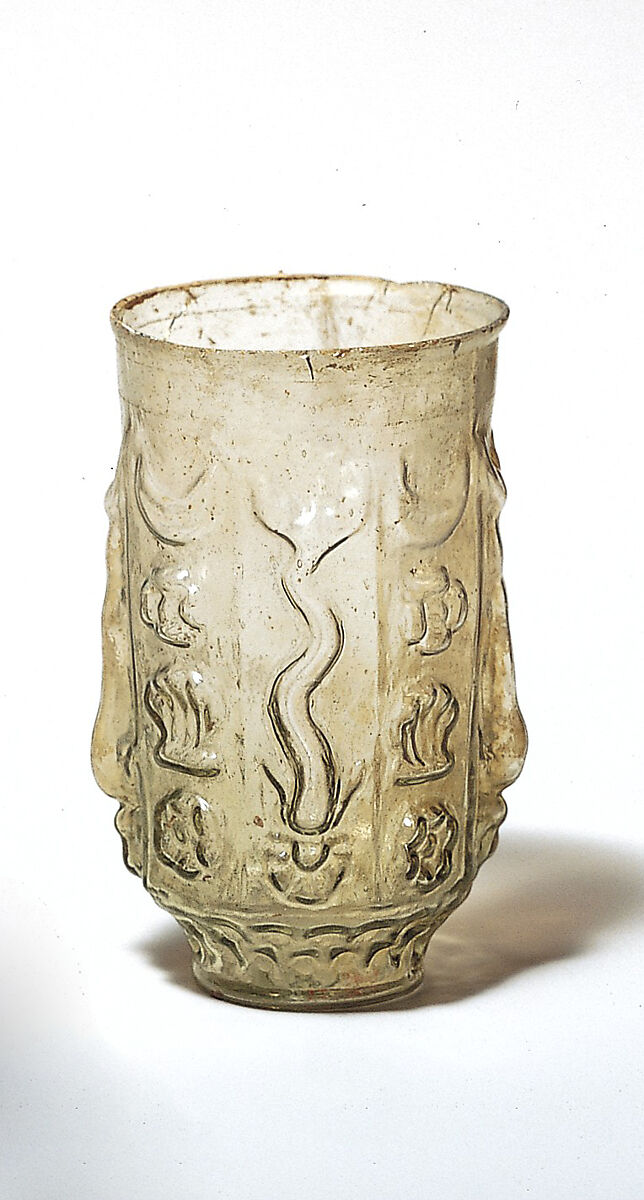 The unique decoration on this beaker is probably meant to recall the circus games, for the Circus Maximus in Rome had lap-counters in the shape of a row of dolphins that allowed spectators to follow the course of a chariot race.