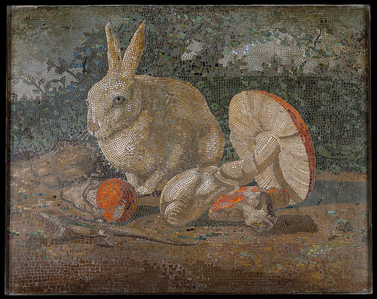- Title: Tile mosaic with rabbit, lizard and mushroom