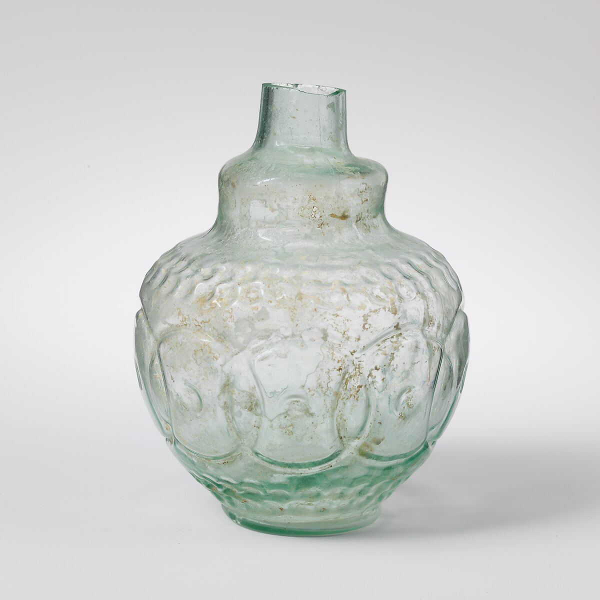 Unworked, knocked-off rim; short cylindrical neck, expanding downwards; sloping shoulder, above tall concave collar; spherical body; projecting rounded edge to base with flat bottom; no pontil mark. Body blown into a four-part mold of three vertical sections, extending to bottom of collar, joined to a shallow, disk-shaped base section.