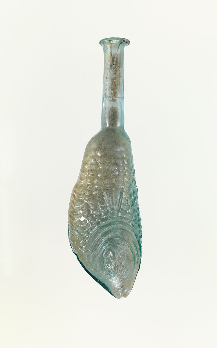 Only a small number of Roman mold-blown bottles in the shape of a fish are known, but they constitute an interesting group for a number of reasons. So far thirteen examples have been recorded. Finds range from Cyprus and western Asia Minor to the Black Sea coast of Moesia and Judaea, while other examples have been found in the West and even in the Persian Gulf. It is likely that the center for production was located in one of the coastal regions of the eastern Mediterranean (the Syro-Palestinian littoral or, possibly, western Asia Minor), whence the vessels could have been easily dispersed by means of maritime trade.