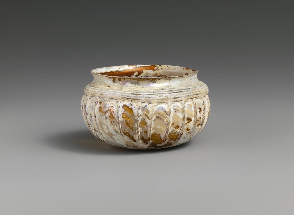 Intact, except for one small, weathered chip in rim; a few bubbles; dulling and pitting of surface bubbles, most of surfaces covered with thick white weathering and iridescence.