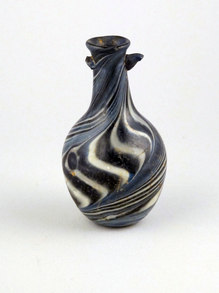 Translucent cobalt blue, with marvered trails in opaque white; handles in same colors.