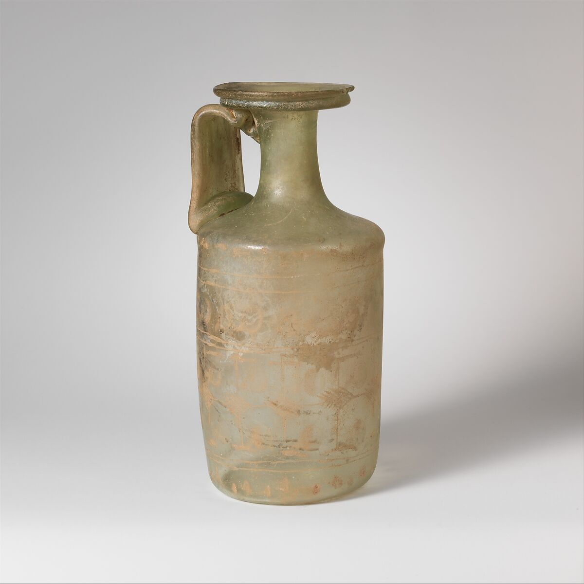 Bottles like this one were used as tableware in later Roman times, presumably for serving wine. Examples are known from the Rhineland, from Pannonia (modern Hungary) on the Danube, and from Syria and Egypt in the East. They therefore may be taken to represent the universal style of the late Roman elite, who traveled widely and freely across the Empire.